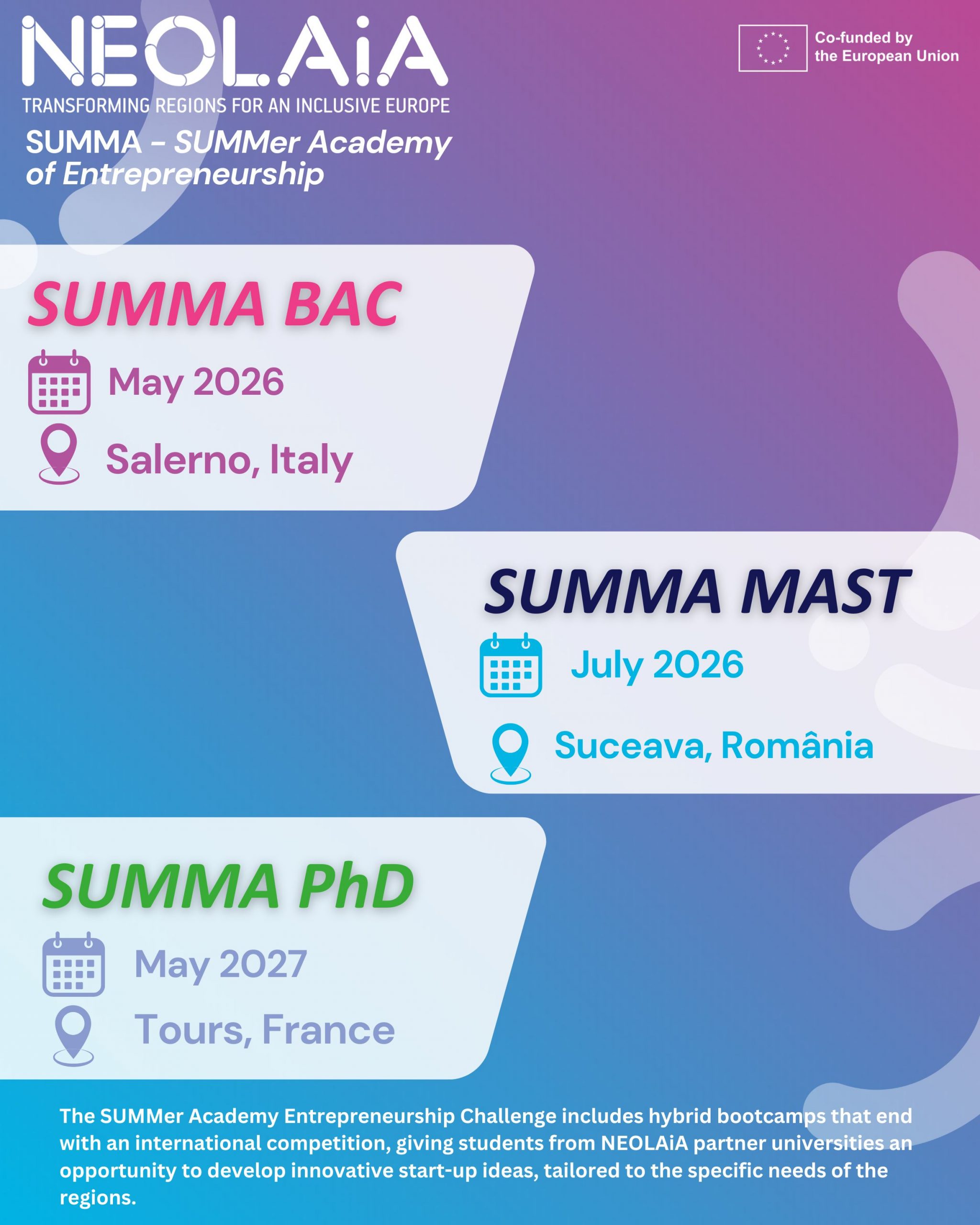 Get ready to take your ideas to the next level! In the academic year 2025–2026, NEOLAiA will launch the first editions of SUMMA – The SUMMer Academy of Entrepreneurship, an inspiring international programme designed to help you generate innovative ideas that address the needs of your regions and create real impact. Let your vision meet the world stage!