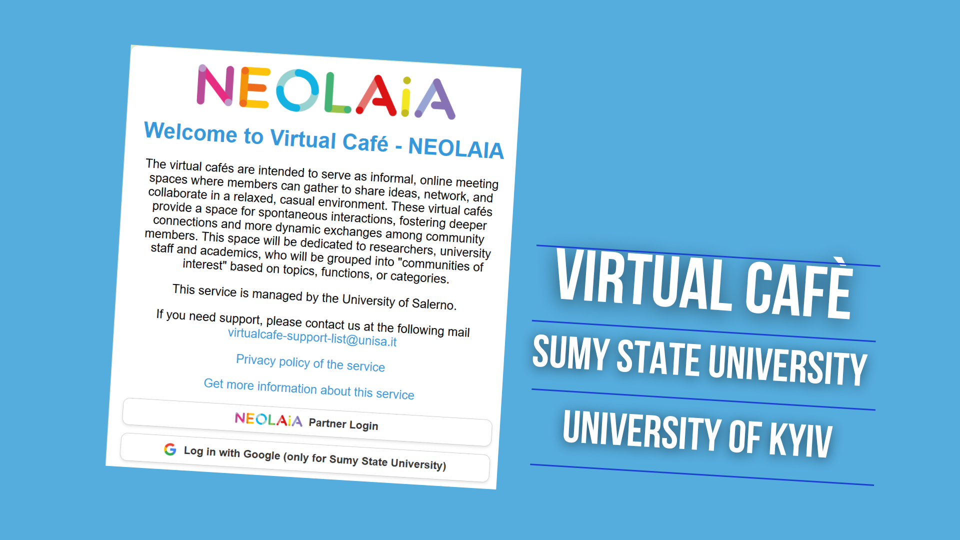 A settembre 2025, il Virtual Café di NEOLAiA ha esteso il proprio accesso anche ai partner associati della rete, con l’apertura ufficiale per la Sumy State University e, poco dopo, per la Borys Grinchenko Metropolitan University of Kyiv.